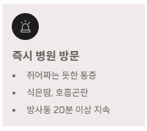 - 즉시 병원에 가야 하는 경우: 통증이 쥐어짜는 듯하거나, 식은땀, 호흡곤란, 어깨나 팔로 방사되는 통증이 20분 이상 지속될 때.