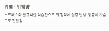 또 다른 흔한 원인으로는 위염이나 위궤양이 있습니다. 스트레스로 인해 위산 분비가 과도해지거나 불규칙한 식사 습관이 지속되면 위 점막에 염증이 생기는데, 이 통증이 가슴 쪽으로 전달되면서 콕콕 찌르는 듯한 느낌을 줄 수 있습니다. 식사 시간이나 특정 음식을 먹은 후에 통증이 온다면 소화기 문제일 가능성이 높습니다.