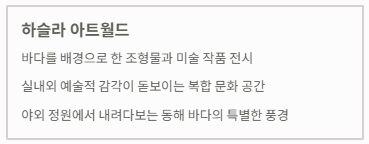 바다를 배경으로 다양한 조형물과 미술 작품이 전시된 복합 문화 공간입니다. 실내외 어디를 둘러봐도 예술적 감각이 돋보입니다. 특히 이곳의 야외 정원에서 내려다보는 동해 바다의 풍경은 다른 곳에서 볼 수 없는 특별한 아름다움이 있습니다. 예술과 자연이 조화롭게 어우러진 곳에서 영감을 얻어 가세요.