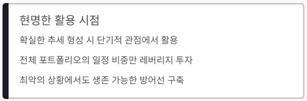 | 분할 진입 전략 | 한 번에 풀 레버리지를 쓰지 않고 주가 움직임에 따라 비중 조절 |