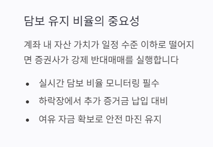 도구를 선택했다면 담보 유지 비율을 반드시 체크해야 합니다. 보통 증권사는 빌려준 돈의 안전을 위해 계좌 내 자산 가치가 일정 수준 이하로 떨어지면 주식을 강제로 파는 반대매매를 실행합니다. 이를 방지하기 위해 실시간으로 담보 비율을 모니터링하고 하락장에서는 추가 증거금을 납입하거나 보유 비중을 줄이는 대응이 필요합니다.