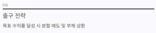| Step 4 | 목표 수익률 도달 시 분할 매도를 통한 부채 상환 |