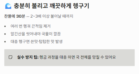 대충 헹구면 국물에서 쓴맛이나 텁텁한 맛이 나기 쉽습니다. 제가 처음 요리를 시작했을 때, 이 과정을 너무 대충 했다가 국 전체를 망친 경험이 있어요. 그때 깨달았습니다. 기본에 충실해야 좋은 결과가 나온다는 것을요. 이는 요리뿐만 아니라 삶의 모든 부분에서 적용되는 중요한 가치관이죠.