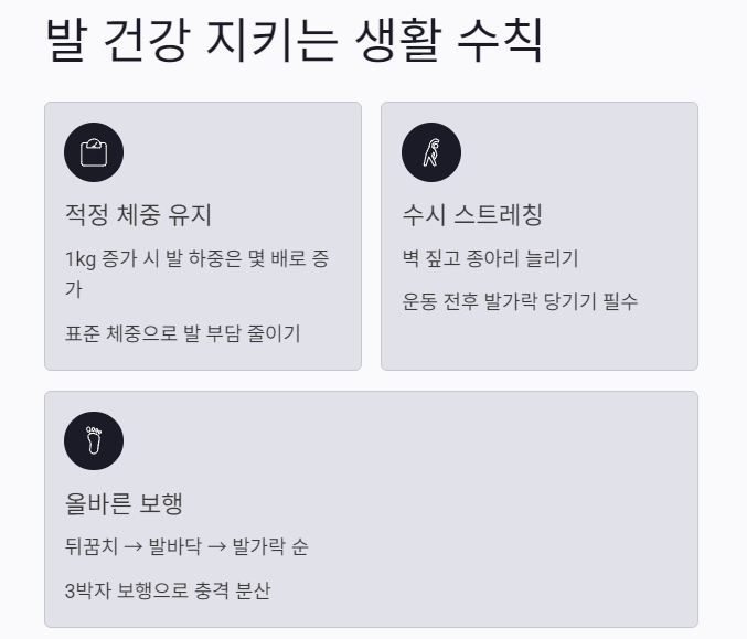 체중이 1kg 늘어날 때마다 발이 받는 하중은 몇 배로 증가합니다. 따라서 식단 관리를 통해 발의 부담을 덜어주는 것이 장기적인 해결책이 됩니다. 또한 운동 전후에는 반드시 발가락을 몸쪽으로 당기는 스트레칭을 생활화하여 근육이 경직되지 않도록 관리해야 합니다.