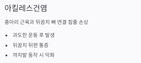 | 주요 증상 | 아침 첫발이 가장 아픔 | 까치발을 들 때 통증 | 오래 서 있을 때 욱신거림 |