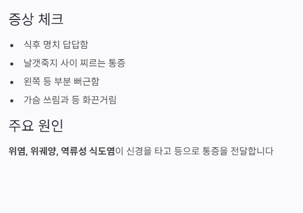 식후에 명치 끝이 답답하면서 날갯죽지 사이나 왼쪽 등 부분이 콕콕 쑤신다면 위산 과다나 점막 손상을 의심해야 합니다. 특히 역류성 식도염이 있는 경우 가슴 쓰림과 함께 등 뒤쪽이 타는 듯한 통증이 동반되기도 합니다.