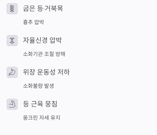 몸의 구조적인 결함이 소화 기능을 떨어뜨리고 등 통증을 유발하는 경우도 적지 않습니다. 굽은 등이나 거북목 자세는 흉추를 압박하는데, 이 주변에는 소화기관을 관장하는 자율신경이 지나갑니다.