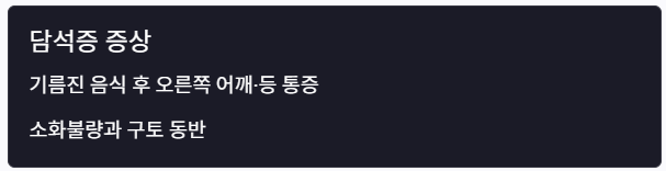 기름진 음식을 먹었을 때 오른쪽 어깨나 오른쪽 등으로 통증이 뻗친다면 담석증을 의심해볼 수 있습니다. 담즙이 제대로 배출되지 않아 발생하는 이 통증은 소화불량과 구토를 동반하는 경우가 많습니다.