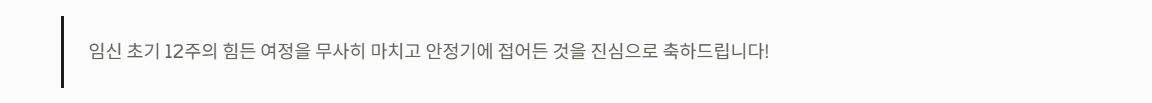 임신 안정기(13주 이후)는 입덧이 완화되고 컨디션이 회복되어 본격적으로 태교를 시작하고 태아와의 교감을 늘릴 수 있는 시기입니다. 이제부터는 태아의 빠른 성장을 위해 균형 잡힌 영양 섭취와 적절한 운동에 집중하며 건강하게 출산을 준비할 차례입니다.