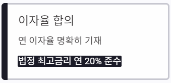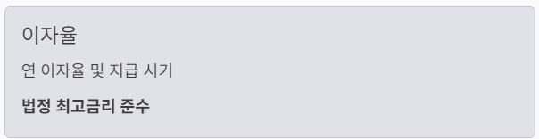 | 이자율 | 연 이자율 및 이자 지급 시기 | 법정 최고금리 준수 |