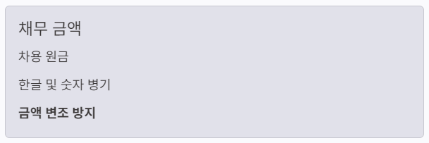 | 채무 금액 | 차용 원금 (한글 및 아라비아 숫자 병기) | 금액 변조 방지 |