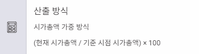 - 산출 방식: 시가총액 가중 방식 (현재 시가총액 / 기준 시점 시가총액 × 100)