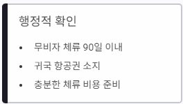| 행정적 관점 | 무비자 체류 기간(90일) 및 리턴 티켓 소지 여부 확인 |