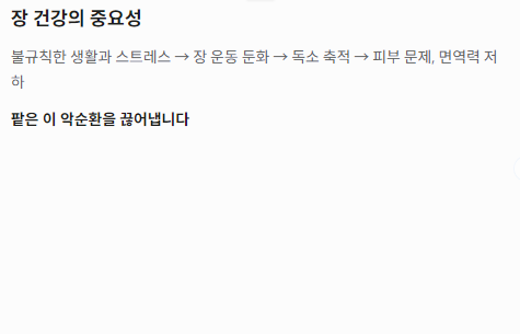 불규칙한 생활과 스트레스는 장 운동을 둔화시켜 변비를 유발합니다. 장 기능 저하는 독소 축적을 불러오며, 이는 피부 문제나 면역력 저하로까지 이어집니다. 건강에서 장의 역할은 매우 중요합니다.
