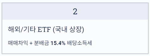 - 해외/기타 ETF(국내 상장): 매매차익과 분배금 모두 15.4% 배당소득세가 부과됩니다.