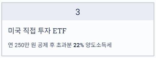 - 해외 상장 ETF(미국 직구): 연간 수익 250만 원까지 공제되며, 초과분에 대해 22% 양도소득세가 분리과세 됩니다.